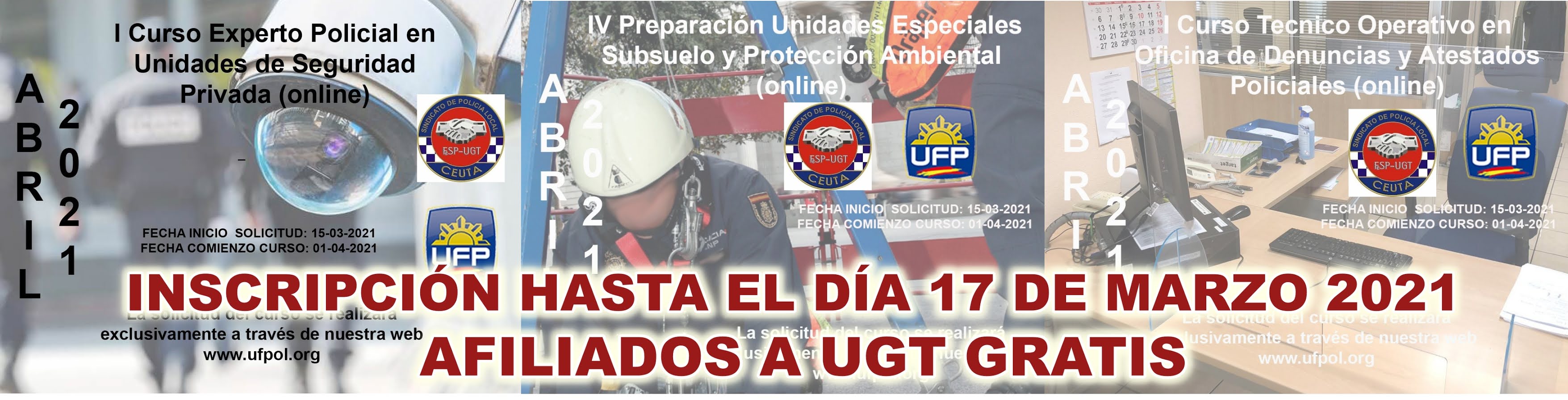 Desde el Sindicato de Policía Local (SPL) de la FeSP-UGT Ceuta, os comunicamos que se abre el plazo de PREINSCRIPCIÓN A LOS CURSOS ONLINE organizados por la Unión Federal de Policía (UFP) hasta el próximo día 15 de MARZO 2021 para los afiliados a UGT: